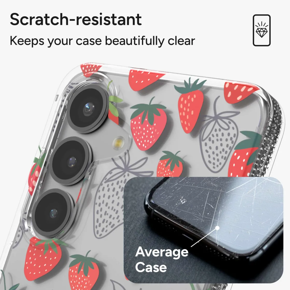 The sleek, stylish Milan case provides up to 13 feet of drop protection. This transparent case features beautiful strawberry and botanical detailing that elevates the look of your phone. Milan is crafted to safeguard your device without compromising style or self-expression.